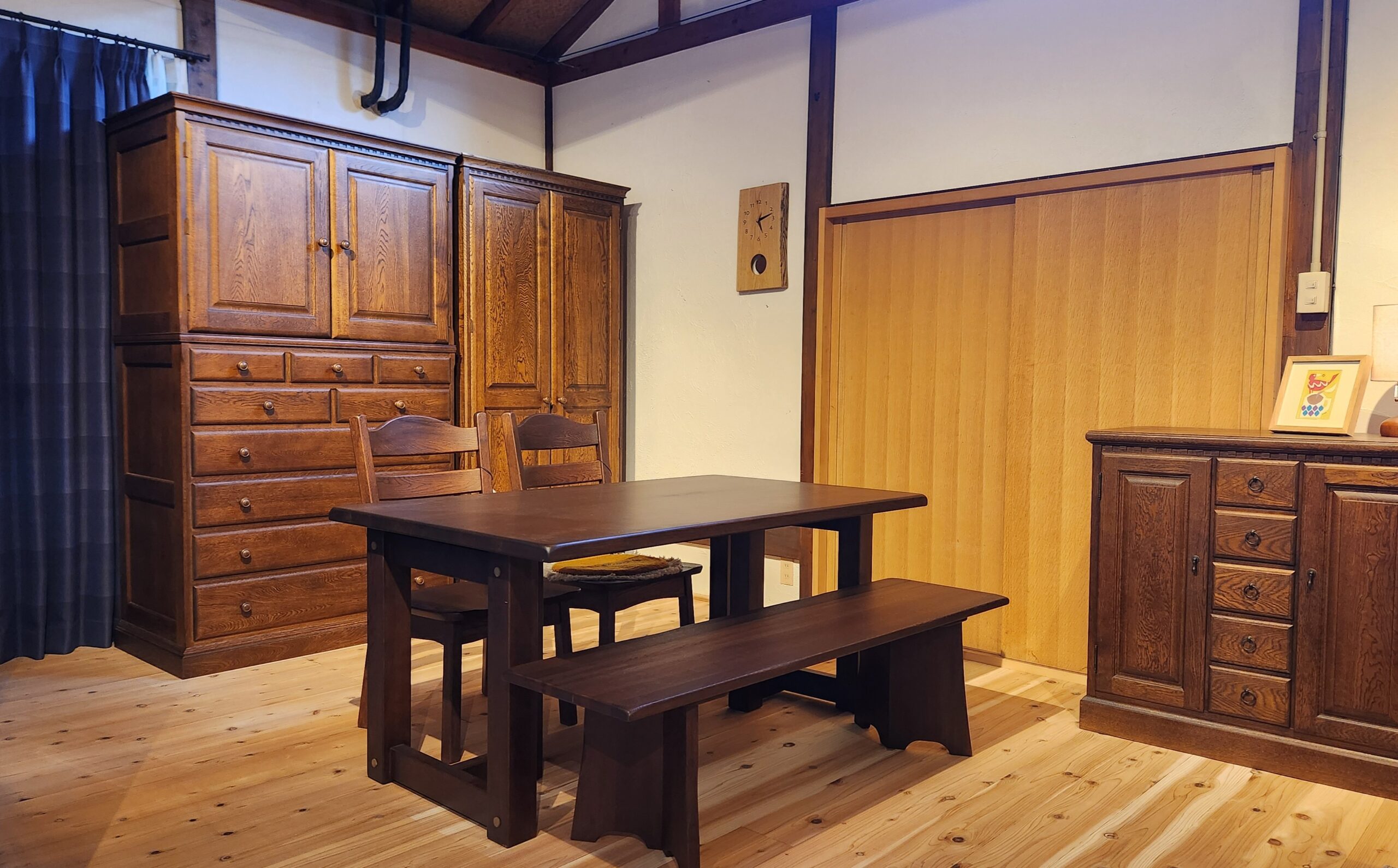葉山家具の「葉山色」は、ナチュラルな色とこのような重厚感ある色のちょうど中間の色合いになっていることで、明るい色・暗い色の建具や床、どちらにも合わせやすくなっています。