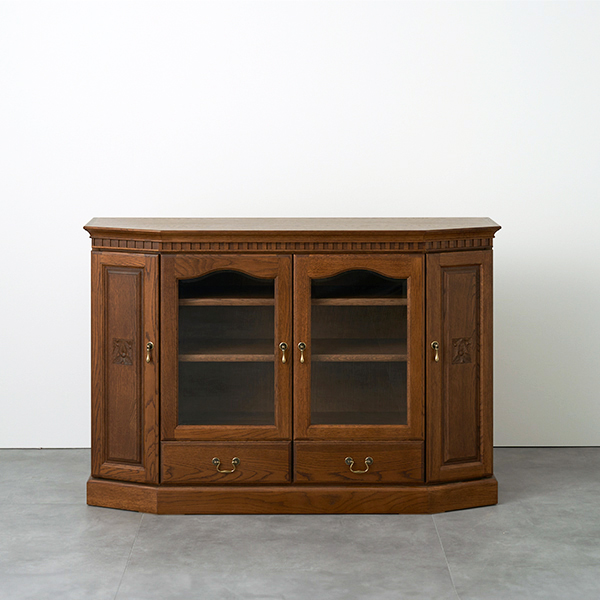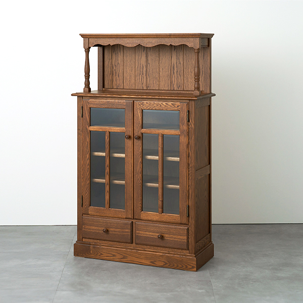 くり棒(くびれのある支柱)の意匠が際立つ飾り棚を備えたアイテムです。