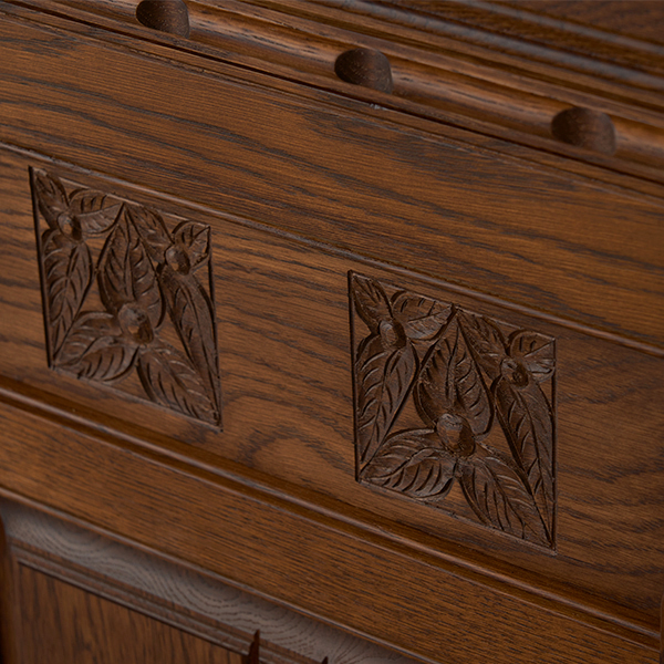 紫陽花やつるバラ、リーフなど、植物をモチーフにした彫刻は、素朴なフォルムの家具に優雅な彩りを添えます。